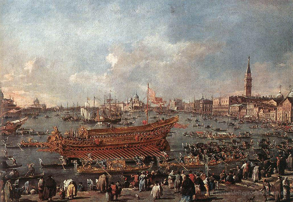 Wir bieten Ihnen eine handgefertigte Reproduktion auf Leinwand des berühmten Kunstwerks 'Der Doge auf dem Bucintoro in der Nähe des Riva di Sant'Elena' von Francesco Guardi, aus dem Reproduktionsmuseum.