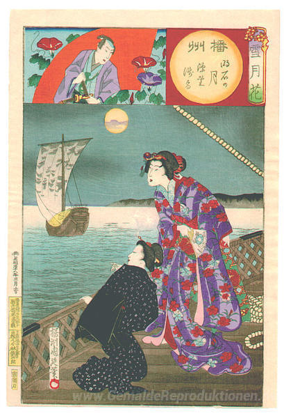 Wir bieten Ihnen eine handgefertigte Reproduktion auf Leinwand des berühmten Kunstwerks 'Akashi Moon: Provinz Harima' von Toyohara Chikanobu, aus dem Reproduktionsmuseum.