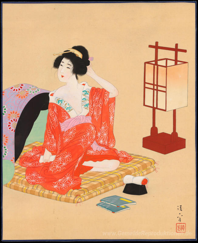 Wir bieten Ihnen eine handgefertigte Reproduktion auf Leinwand des berühmten Kunstwerks 'Bijin Vorbereitung für Schlaf-' von Kiyokata Kaburagi, aus dem Reproduktionsmuseum.