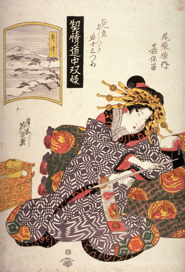Wir bieten Ihnen eine handgefertigte Reproduktion auf Leinwand des berühmten Kunstwerks 'Die Kurtisane von Kaoru Owariya abgestimmt mit Okitsu' von Keisai Eisen, aus dem Reproduktionsmuseum.