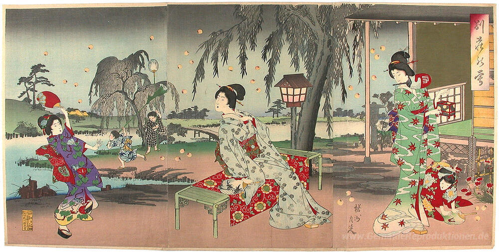 Wir bieten Ihnen eine handgefertigte Reproduktion auf Leinwand des berühmten Kunstwerks 'Fireflies in einem Landhaus' von Toyohara Chikanobu, aus dem Reproduktionsmuseum.