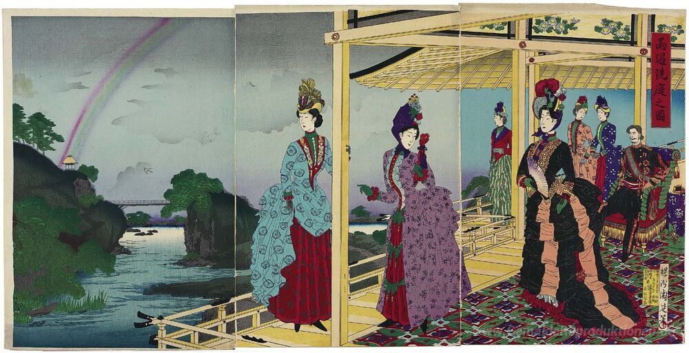 Wir bieten Ihnen eine handgefertigte Reproduktion auf Leinwand des berühmten Kunstwerks 'Illustration der Garten aktualisiert nach dem Regen' von Toyohara Chikanobu, aus dem Reproduktionsmuseum.