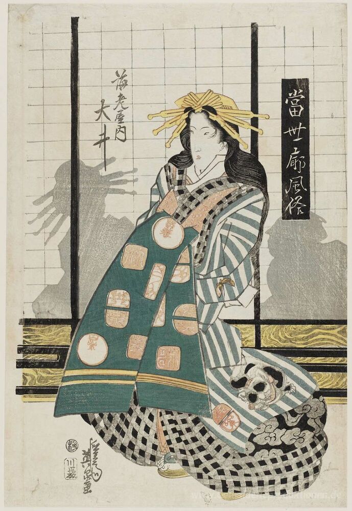 Wir bieten Ihnen eine handgefertigte Reproduktion auf Leinwand des berühmten Kunstwerks 'Oi des Ebiya, aus der Serie moderner Zoll von den Vergnügungsvie' von Keisai Eisen, aus dem Reproduktionsmuseum.