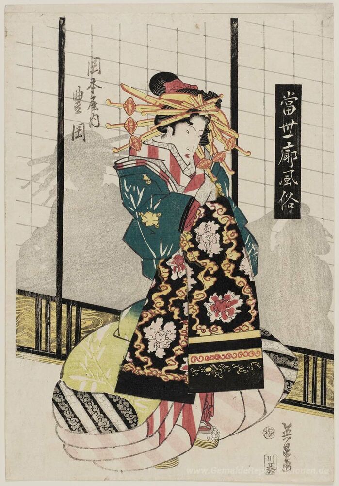 Wir bieten Ihnen eine handgefertigte Reproduktion auf Leinwand des berühmten Kunstwerks 'Toyooka des Okamotoya' von Keisai Eisen, aus dem Reproduktionsmuseum.