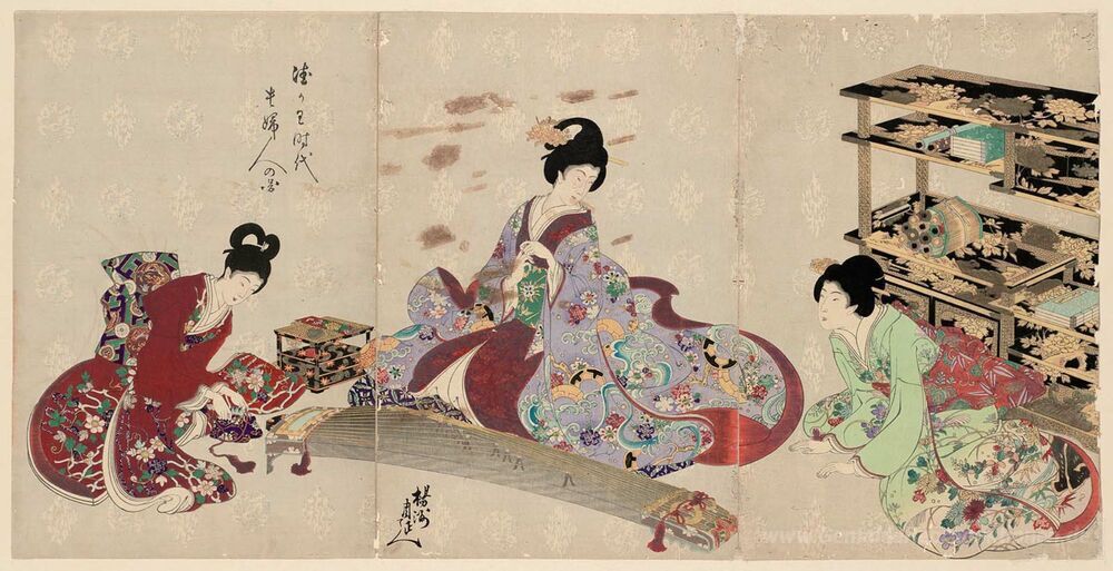 Wir bieten Ihnen eine handgefertigte Reproduktion auf Leinwand des berühmten Kunstwerks 'Vorbereitung auf die Koto zu spielen' von Toyohara Chikanobu, aus dem Reproduktionsmuseum.