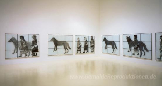 Wir bieten Ihnen eine handgefertigte Reproduktion auf Leinwand des berühmten Kunstwerks 'Bande von Mädchen und Rudel Wölfe' von Kiki Smith, aus dem Reproduktionsmuseum.