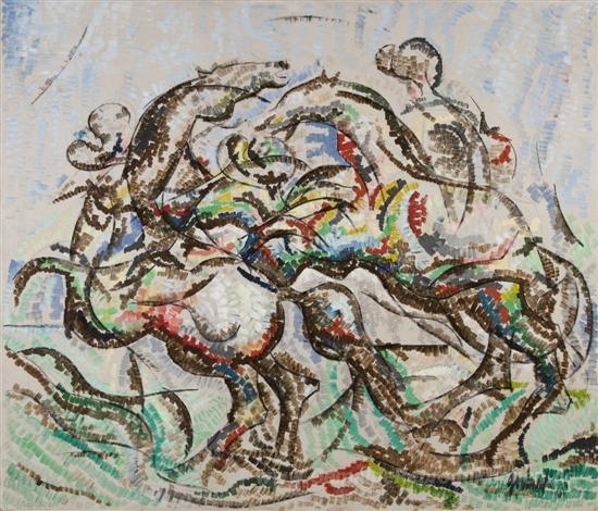 Wir bieten Ihnen eine handgefertigte Reproduktion auf Leinwand des berühmten Kunstwerks 'Bewegung der Pferde' von Robert Goodnough, aus dem Reproduktionsmuseum.