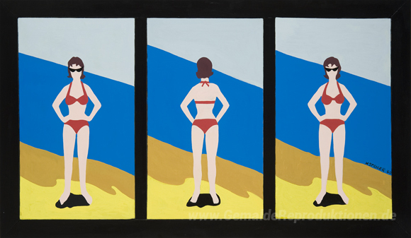 Wir bieten Ihnen eine handgefertigte Reproduktion auf Leinwand des berühmten Kunstwerks 'Bikini-Triptychon' von Marjorie Strider, aus dem Reproduktionsmuseum.