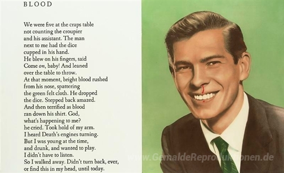 Wir bieten Ihnen eine handgefertigte Reproduktion auf Leinwand des berühmten Kunstwerks 'Blood (Für Raymond Carver)' von John Baldessari, aus dem Reproduktionsmuseum.