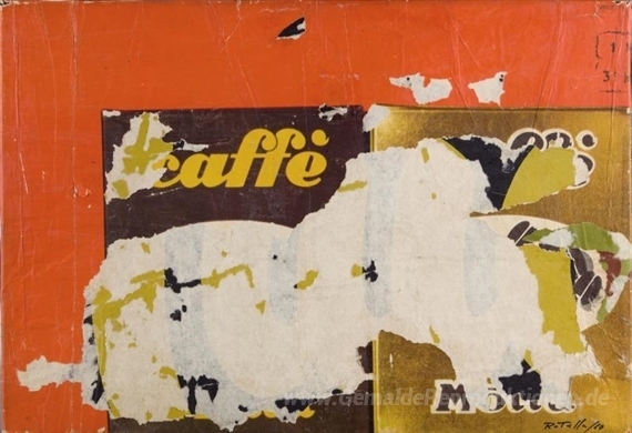 Wir bieten Ihnen eine handgefertigte Reproduktion auf Leinwand des berühmten Kunstwerks 'Caffè' von Mimmo Rotella, aus dem Reproduktionsmuseum.