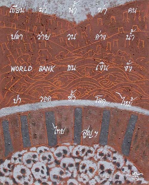 Wir bieten Ihnen eine handgefertigte Reproduktion auf Leinwand des berühmten Kunstwerks 'Dam Kills Wasser, Kills Man, Kills Fisch' von Vasan Sitthiket, aus dem Reproduktionsmuseum.