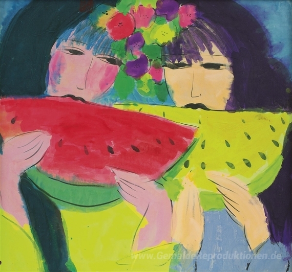 Wir bieten Ihnen eine handgefertigte Reproduktion auf Leinwand des berühmten Kunstwerks 'Damen mit Wassermelonen' von Walasse Ting, aus dem Reproduktionsmuseum.
