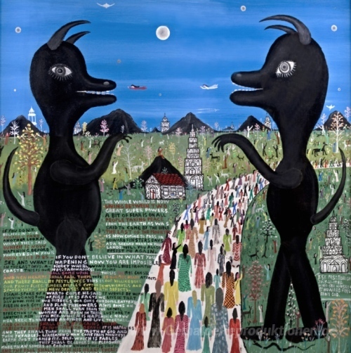 Wir bieten Ihnen eine handgefertigte Reproduktion auf Leinwand des berühmten Kunstwerks 'Das Super Powers (4581)' von Howard Finster, aus dem Reproduktionsmuseum.