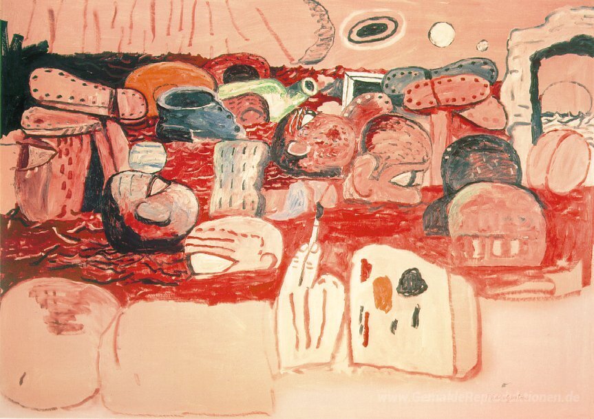 Wir bieten Ihnen eine handgefertigte Reproduktion auf Leinwand des berühmten Kunstwerks 'Deluge II' von Philip Guston, aus dem Reproduktionsmuseum.
