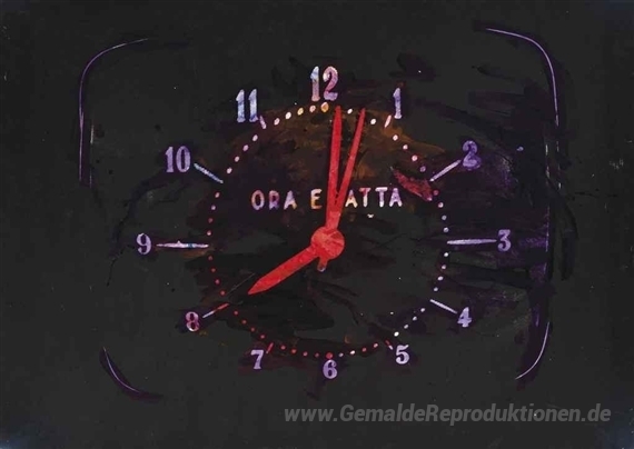Wir bieten Ihnen eine handgefertigte Reproduktion auf Leinwand des berühmten Kunstwerks 'Die genaue Zeit' von Mario Schifano, aus dem Reproduktionsmuseum.