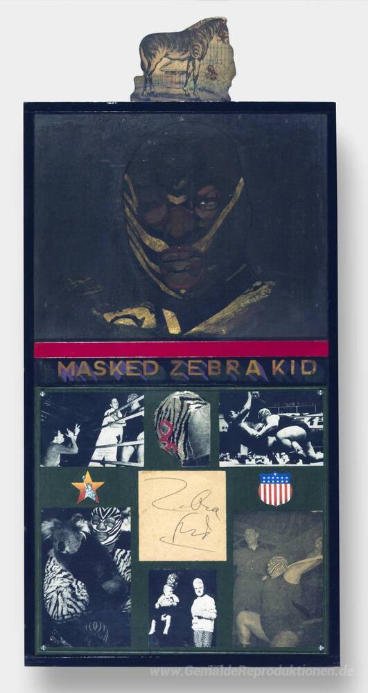 Wir bieten Ihnen eine handgefertigte Reproduktion auf Leinwand des berühmten Kunstwerks 'Die maskierte Zebra Kid' von Peter Blake, aus dem Reproduktionsmuseum.