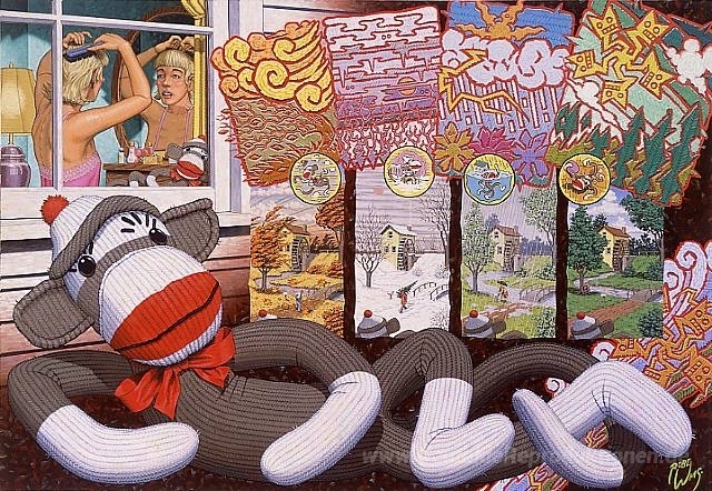 Wir bieten Ihnen eine handgefertigte Reproduktion auf Leinwand des berühmten Kunstwerks 'Die vier Jahreszeiten durch die Augen von Jessicas Sock Monkey g' von Robert Williams, aus dem Reproduktionsmuseum.