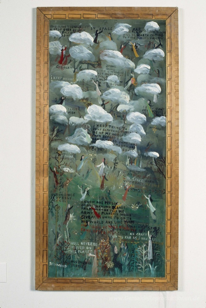 Willkommen in der faszinierenden Welt der Ölgemälde, wo hochwertige Kunstwerke und talentierte Künstler aufeinandertreffen. Jedes Gemälde erzählt seine eigene Geschichte und vermittelt Emotionen, die den Raum, in dem sie hängen, lebendiger machen. Ein herausragendes Beispiel hierfür ist das Werk Diesen Planet ist nur ein Stopover von Howard Finster. Der amerikanische Künstler, bekannt für seinen einzigartigen naiven Stil, verbindet tiefgreifende Themen mit einer verspielten Ästhetik.