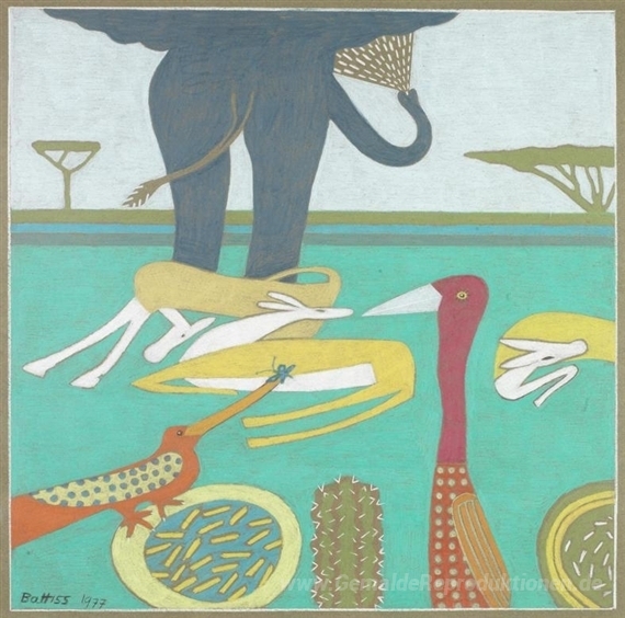 Willkommen in unserer exquisiten Kollektion von Ölgemälden, wo jedes Kunstwerk eine Geschichte erzählt. Entdecken Sie das eindrucksvolle Gemälde Elefanten und andere Tiere, geschaffen von dem renommierten Künstler Walter Battiss. Battiss, ein Pionier des modernen Kunststils in Südafrika, kombiniert lebendige Farben und dynamische Formen, um die Schönheit der Natur einzufangen.