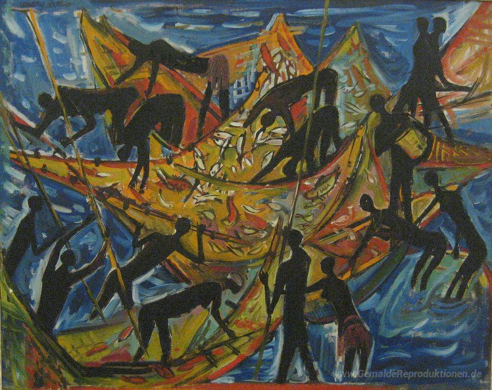Wir bieten Ihnen eine handgefertigte Reproduktion auf Leinwand des berühmten Kunstwerks 'Fisherman Drawing Nets' von Walter Battiss, aus dem Reproduktionsmuseum.