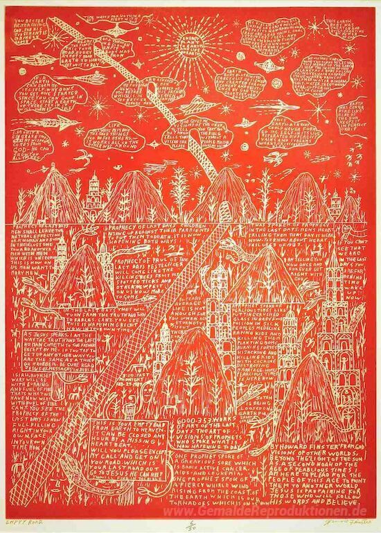 Wir bieten Ihnen eine handgefertigte Reproduktion auf Leinwand des berühmten Kunstwerks 'Freie Straße (orange / rot)' von Howard Finster, aus dem Reproduktionsmuseum.