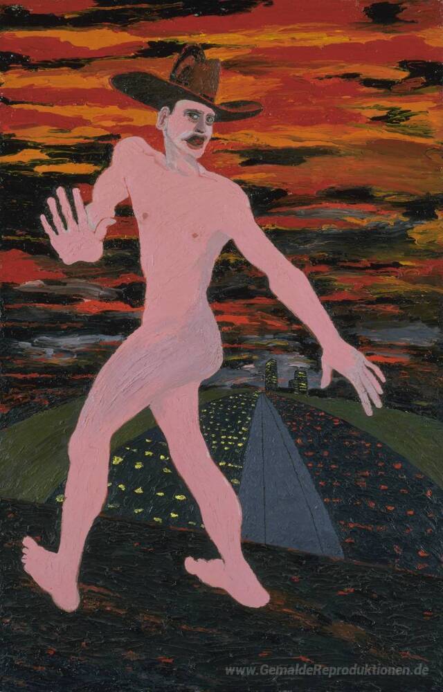 Wir bieten Ihnen eine handgefertigte Reproduktion auf Leinwand des berühmten Kunstwerks 'Frightened Cowboy' von Derek Boshier, aus dem Reproduktionsmuseum.