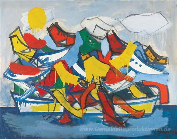 Wir bieten Ihnen eine handgefertigte Reproduktion auf Leinwand des berühmten Kunstwerks 'Glückliche Boatride' von Robert Goodnough, aus dem Reproduktionsmuseum.