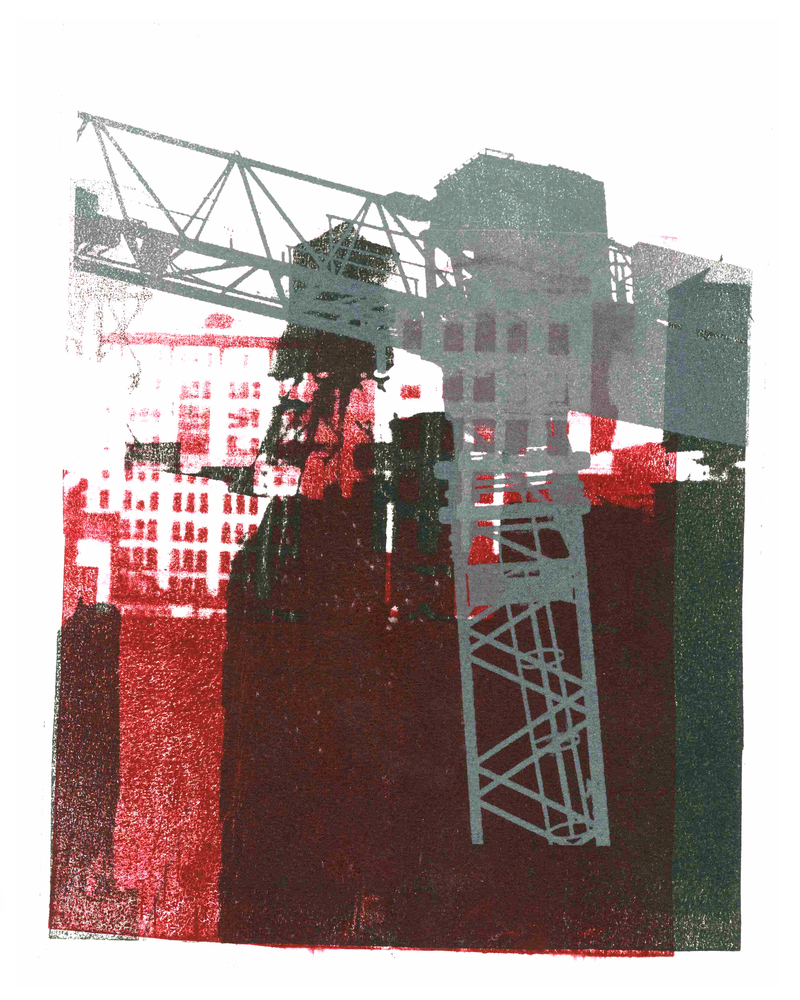 Wir bieten Ihnen eine handgefertigte Reproduktion auf Leinwand des berühmten Kunstwerks 'Graues Gebäude Kran und Wassertürme in Manhattan' von Hilly van Eerten, aus dem Reproduktionsmuseum.