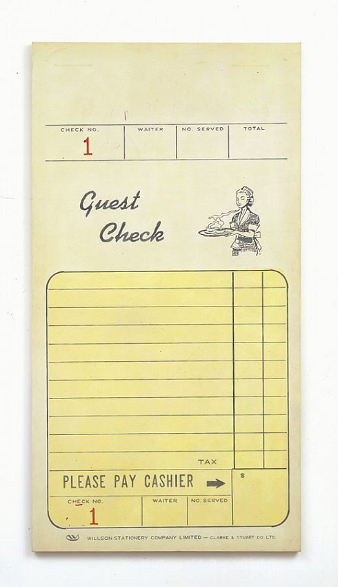 Wir bieten Ihnen eine handgefertigte Reproduktion auf Leinwand des berühmten Kunstwerks 'Guest Check' von Alex Hay, aus dem Reproduktionsmuseum.