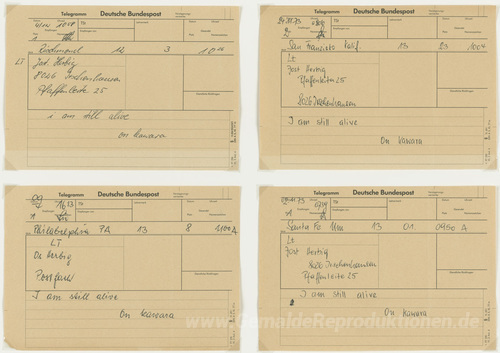 Wir bieten Ihnen eine handgefertigte Reproduktion auf Leinwand des berühmten Kunstwerks 'I Am Still Alive (vier Telegramme)' von On Kawara, aus dem Reproduktionsmuseum.