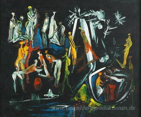 Wir bieten Ihnen eine handgefertigte Reproduktion auf Leinwand des berühmten Kunstwerks 'Jungle Pool' von Walter Battiss, aus dem Reproduktionsmuseum.