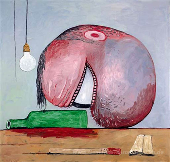 Wir bieten Ihnen eine handgefertigte Reproduktion auf Leinwand des berühmten Kunstwerks 'Kopf und Flasche' von Philip Guston, aus dem Reproduktionsmuseum.
