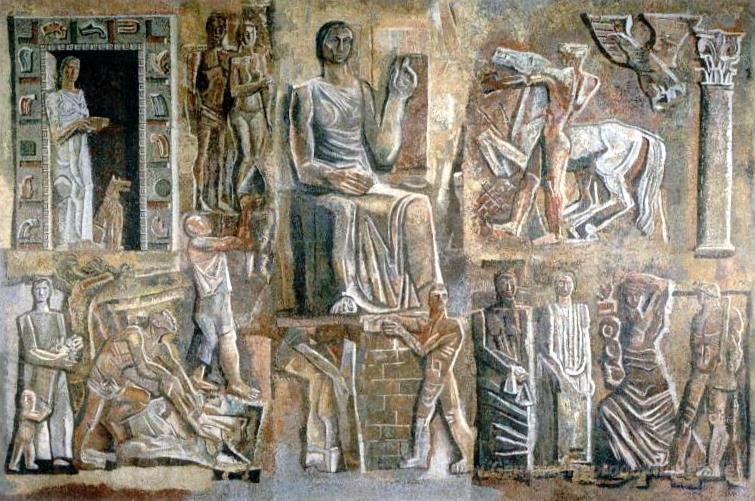 Wir bieten Ihnen eine handgefertigte Reproduktion auf Leinwand des berühmten Kunstwerks 'Korporative Italien' von Mario Sironi, aus dem Reproduktionsmuseum.