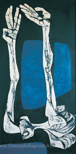 Wir bieten Ihnen eine handgefertigte Reproduktion auf Leinwand des berühmten Kunstwerks 'Las Manos' von Oswaldo Guayasamin, aus dem Reproduktionsmuseum.