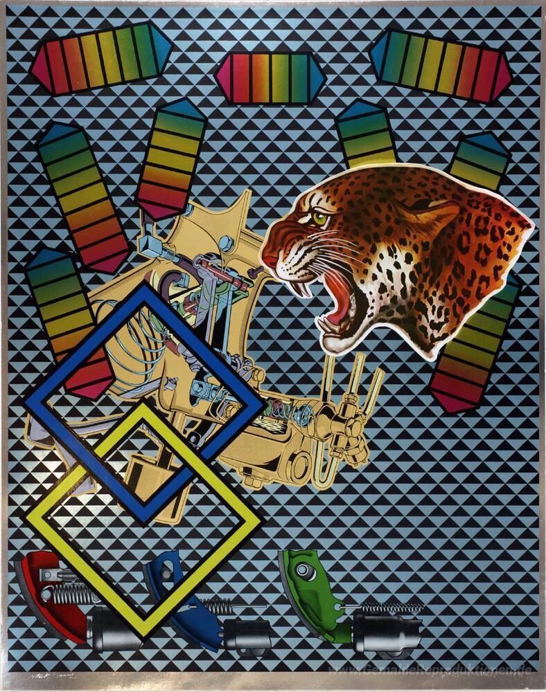Willkommen in der faszinierenden Welt der Ölgemälde, wo jeder Pinselstrich eine Geschichte erzählt. Unser Fokus liegt auf den beeindruckenden Werken des talentierten Künstlers Peter Phillips, dessen Meisterwerk „Laufrad“ die Grenzen zwischen Abstraktion und Realismus verwischt. Phillips’ Stil vereint innovative Techniken und eine brillante Farbpalette, die das Kunstwerk zum Leben erwecken und eine fesselnde visuelle Dynamik erzeugen.