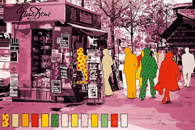 Wir bieten Ihnen eine handgefertigte Reproduktion auf Leinwand des berühmten Kunstwerks 'Le Kiosque' von Gerard Fromanger, aus dem Reproduktionsmuseum.