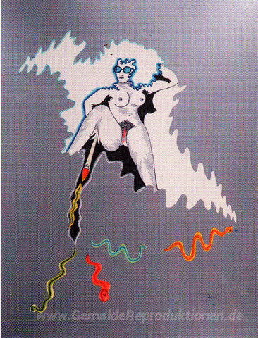 Wir bieten Ihnen eine handgefertigte Reproduktion auf Leinwand des berühmten Kunstwerks 'Le pinceau de la Gorgone' von Evelyne Axell, aus dem Reproduktionsmuseum.