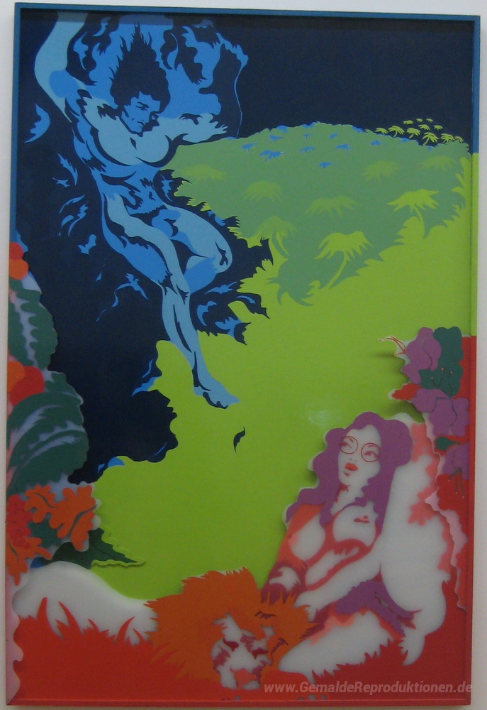 Wir bieten Ihnen eine handgefertigte Reproduktion auf Leinwand des berühmten Kunstwerks 'Le retour de Tarzan' von Evelyne Axell, aus dem Reproduktionsmuseum.