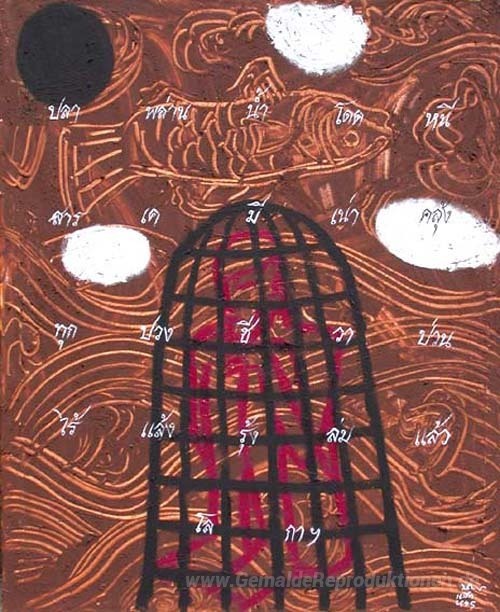 Wir bieten Ihnen eine handgefertigte Reproduktion auf Leinwand des berühmten Kunstwerks 'Mad Fish Wegfliegen' von Vasan Sitthiket, aus dem Reproduktionsmuseum.