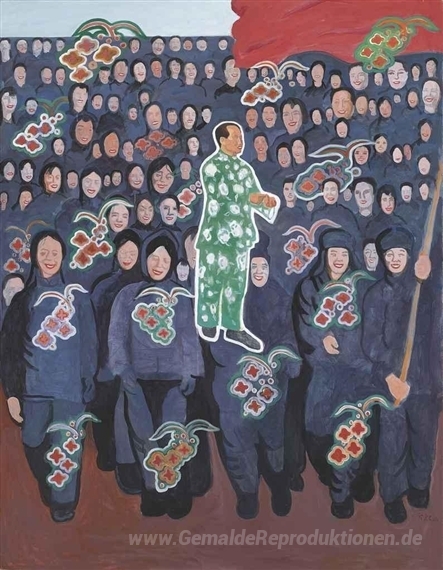 Wir bieten Ihnen eine handgefertigte Reproduktion auf Leinwand des berühmten Kunstwerks 'Mao und seine Leute - Blau' von Yu Youhan, aus dem Reproduktionsmuseum.