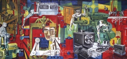 Wir bieten Ihnen eine handgefertigte Reproduktion auf Leinwand des berühmten Kunstwerks 'Maschinen' von Vicente Manansala, aus dem Reproduktionsmuseum.