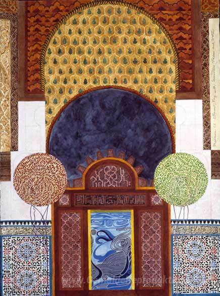 Wir bieten Ihnen eine handgefertigte Reproduktion auf Leinwand des berühmten Kunstwerks 'Medersa El-Attarin, Fez, mit Secession Bäume und Wasser' von Joyce Kozloff, aus dem Reproduktionsmuseum.