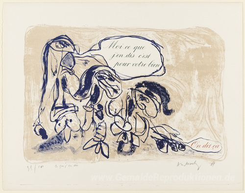 Wir bieten Ihnen eine handgefertigte Reproduktion auf Leinwand des berühmten Kunstwerks 'Mein Rat an Sie (Ce que j'en dis)' von Pierre Alechinsky, aus dem Reproduktionsmuseum.