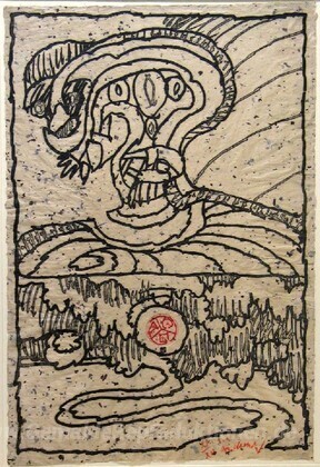 Wir bieten Ihnen eine handgefertigte Reproduktion auf Leinwand des berühmten Kunstwerks 'Natürliche Grenze (Frontière naturelle)' von Pierre Alechinsky, aus dem Reproduktionsmuseum.