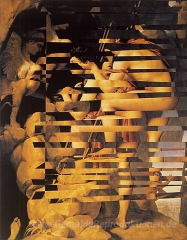 Wir bieten Ihnen eine handgefertigte Reproduktion auf Leinwand des berühmten Kunstwerks 'Oedipe expliqué l'énigme du Sphinx' von Pol Bury, aus dem Reproduktionsmuseum.