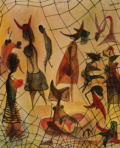 Wir bieten Ihnen eine handgefertigte Reproduktion auf Leinwand des berühmten Kunstwerks 'Parque dos Insultos' von Marcelino Vespeira, aus dem Reproduktionsmuseum.