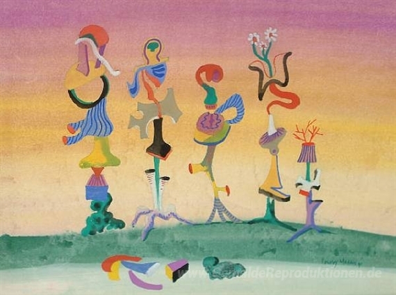 Wir bieten Ihnen eine handgefertigte Reproduktion auf Leinwand des berühmten Kunstwerks 'Präfiguration' von Conroy Maddox, aus dem Reproduktionsmuseum.