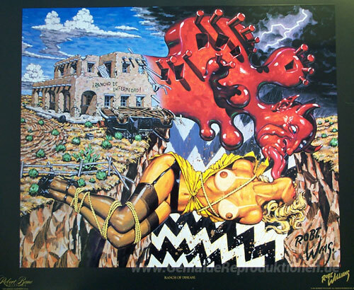 Wir bieten Ihnen eine handgefertigte Reproduktion auf Leinwand des berühmten Kunstwerks 'Ranch of Disease' von Robert Williams, aus dem Reproduktionsmuseum.