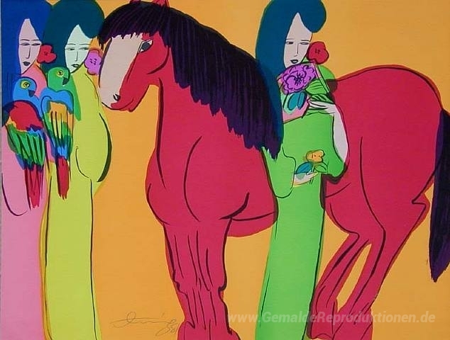 Wir bieten Ihnen eine handgefertigte Reproduktion auf Leinwand des berühmten Kunstwerks 'Red Horse, Oranger Hintergrund' von Walasse Ting, aus dem Reproduktionsmuseum.