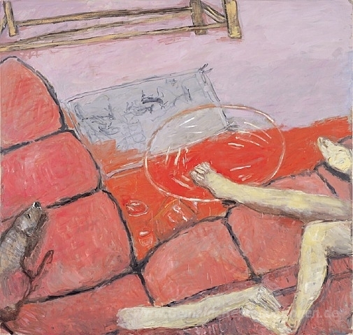Wir bieten Ihnen eine handgefertigte Reproduktion auf Leinwand des berühmten Kunstwerks 'Rosa Couch' von Susan Rothenberg, aus dem Reproduktionsmuseum.